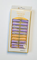 Bring elegance and sparkle to your fingertips with the Lavender Luxe set. This 24-piece collection features long, salon-style nails in a stunning mix of soft lavender tones, shimmering gold glitter accents, and crystal embellishments that add the perfect touch of glam.